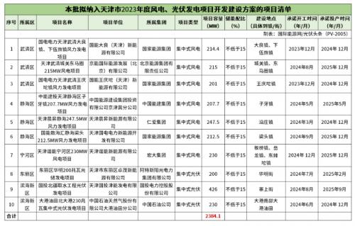 本次納入天津市2023年風(fēng)電、光伏發(fā)電項目共計10個,規(guī)模總計2384.1MW,其中,風(fēng)電項目7個,規(guī)??傆?528.1MW;光伏項目3個,規(guī)模總計856MW。