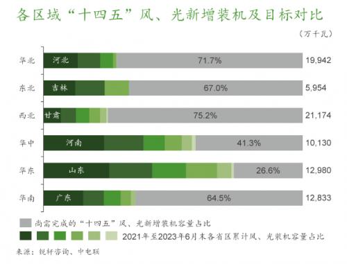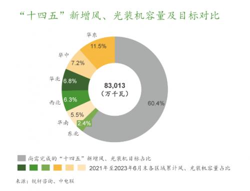 截至2023年6月末,全國(guó)31省區(qū)(不含港澳臺(tái))發(fā)布的“十四五”期末累計(jì)風(fēng)、光裝機(jī)目標(biāo)共計(jì)13.7億千瓦,包括此期間新增風(fēng)、光裝機(jī)目標(biāo)8.3億千瓦。
