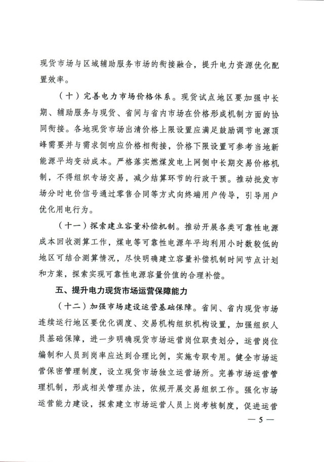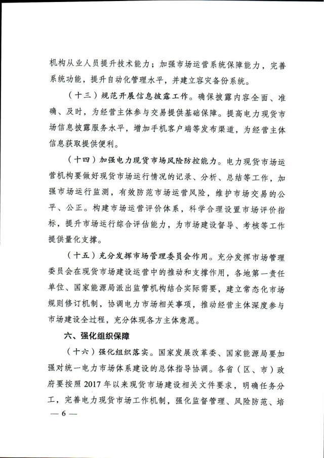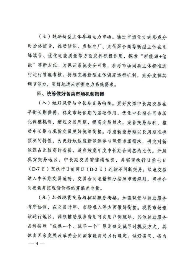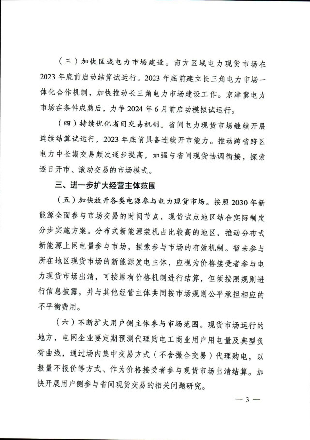 通知提出,加快放開各類電源參與電力現(xiàn)貨市場。按照2030年新能源全面參與市場交易的時(shí)間節(jié)點(diǎn),現(xiàn)貨試點(diǎn)地區(qū)結(jié)合實(shí)際制定分步實(shí)施方案。分布式新能源裝機(jī)占比較高的地區(qū),推動分布式新能源上網(wǎng)電量參與市場,探索參與市場的有效機(jī)制。暫未參與所在地區(qū)現(xiàn)貨市場的新能源發(fā)電主體,應(yīng)視為價(jià)格接受者參與電力現(xiàn)貨市場出清,可按原有價(jià)格機(jī)制進(jìn)行結(jié)算,但須按照規(guī)則進(jìn)行信息披露,并與其他經(jīng)營主體共同按市場規(guī)則公平承擔(dān)相應(yīng)的不平衡費(fèi)用。