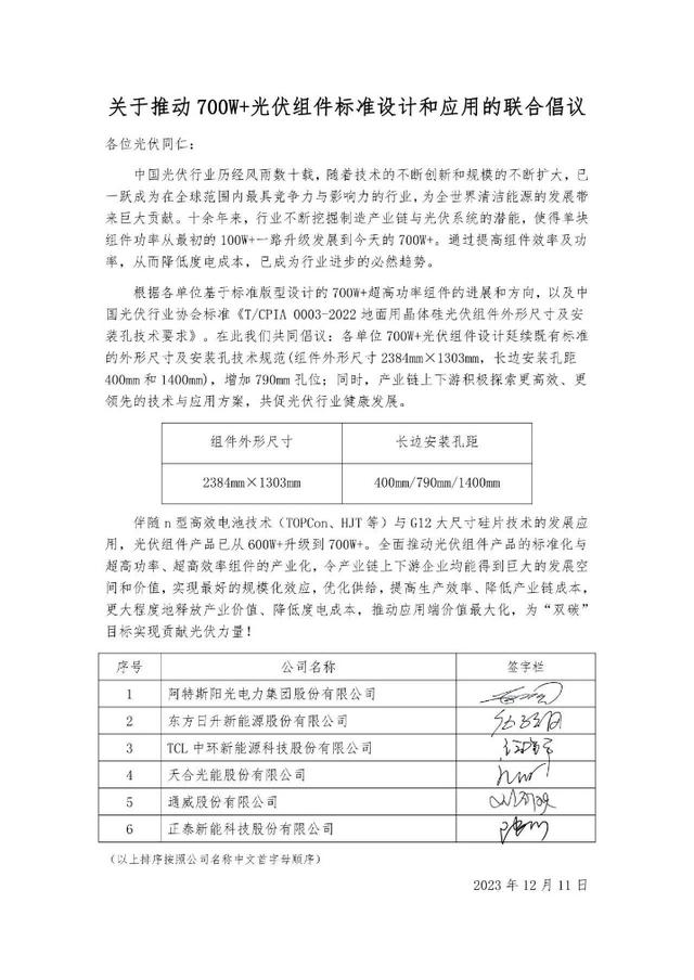 12月11日阿特斯陽光電力集團、東方日升、TCL中環(huán)、天合光能、通威股份、正泰新能等公司發(fā)布聯(lián)合倡議,推動700W+光伏組件標準設計和應用。倡議提出,各單位700W+光伏組件設計延續(xù)既有標準的外形尺寸及安裝孔技術規(guī)范(組件外形尺寸2384mm×1303mm,長邊安裝孔距400mm和1400mm),增加790mm孔位;同時,產(chǎn)業(yè)鏈上下游積極探索更高效、更領先的技術與應用方案,共促光伏行業(yè)健康發(fā)展。