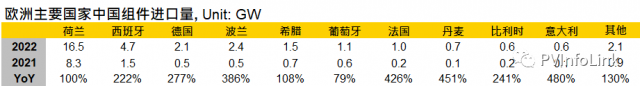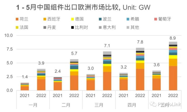 目前中國主要出口成長的區(qū)域市場,仍是目前能源轉(zhuǎn)型最積極,同時也因俄羅斯和烏克蘭沖突下能源供應(yīng)不穩(wěn)定而面臨能源危機的歐洲。歐洲五月從中國進口了8.9GW的光伏組件,同比成長146%,1 – 5月則是累計了33.3GW,同比成長144%,為各區(qū)域市場中成長最高。2021年歐洲全年進口量已經(jīng)是最高的40.9GW,占中國2021年出口的46%,在基期已高且今年仍呈現(xiàn)逐月成長的態(tài)勢下,印證了歐洲市場對于光伏產(chǎn)品的需求仍然強勁。