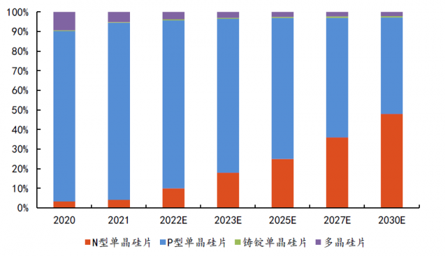 N型硅片滲透率持續(xù)提升,高性能坩堝需求激增。根據(jù)CPIA數(shù)據(jù),2021年N型單晶硅片滲透率約4.1%,隨著下游對(duì)單晶產(chǎn)品的需求增大,單晶硅片市場(chǎng)占比也將進(jìn)一步增大,且N型單晶硅片占比將持續(xù)提升。