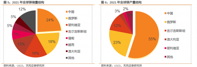 據(jù)USGS數(shù)據(jù),2021年全球銻資源儲(chǔ)備量>200萬噸,我國儲(chǔ)備量最大達(dá)48萬噸,占比24%;俄羅斯、玻利維亞、吉爾吉斯斯坦等國儲(chǔ)量占比靠前。產(chǎn)量方面,2021年全球銻產(chǎn)量約11萬噸,我國是全球第一大銻生產(chǎn)國,產(chǎn)量占比55%(6萬噸);俄羅斯和吉爾吉斯斯坦等國產(chǎn)量靠前。