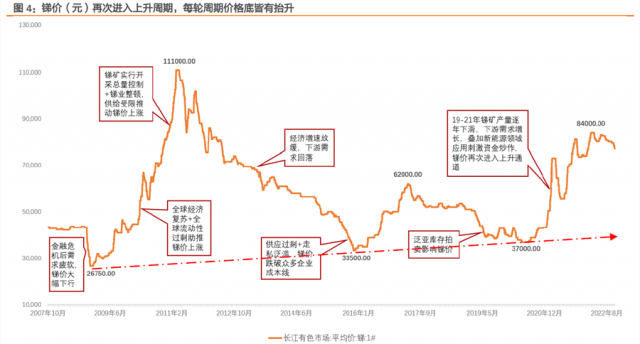 中郵證券還提到,銻可能是2023年有色最亮眼的品種,銻價(jià)有望進(jìn)入強(qiáng)力上漲通道,目前8萬/噸,歷史高點(diǎn)是2011年的12萬,有望創(chuàng)新高。