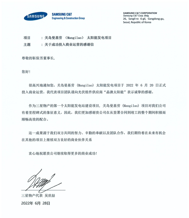 為表示對(duì)晶澳在項(xiàng)目建設(shè)過程中的大力支持以及對(duì)晶澳高品質(zhì)產(chǎn)品的贊賞和感謝,三星物產(chǎn)在項(xiàng)目建成后特寄來感謝信,以表謝意。三星物產(chǎn)在感謝信中寫道:“作為三星物產(chǎn)的第一個(gè)太陽能發(fā)電站建設(shè)項(xiàng)目,關(guān)島曼基勞項(xiàng)目對(duì)我們公司有著里程碑式的象征意義,因此,我們更加感謝貴公司在從簽署合同到竣工的整個(gè)期間積極而順暢高效的配合?!?/p>