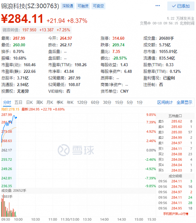 8月18日早盤,錦浪科技(SZ:300763)股價(jià)大漲8.37%,報(bào)284.11元/股,總市值首次突破千億大關(guān)!