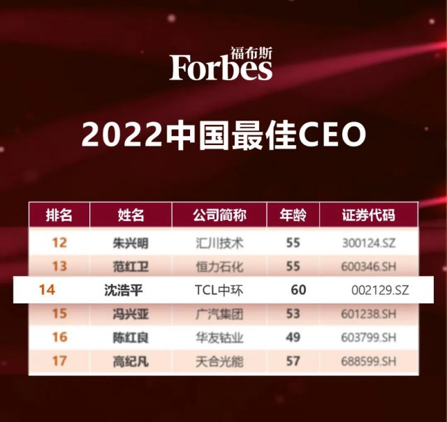 TCL中環(huán)總經(jīng)理沈浩平入選福布斯2022中國(guó)最佳CEO榜