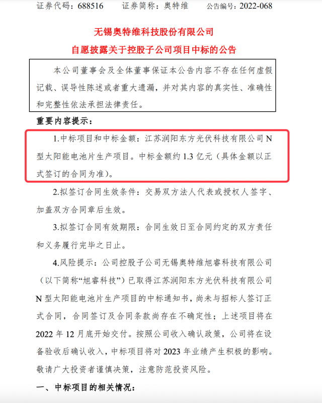 近日,奧特維公告稱,公司控股子公司無錫奧特維旭睿科技有限公司已取得江蘇潤陽東方光伏科技有限公司N型太陽能電池片生產(chǎn)項目的中標通知書,上述項目將在2022年12月底開始交付。中標金額約1.3億元。