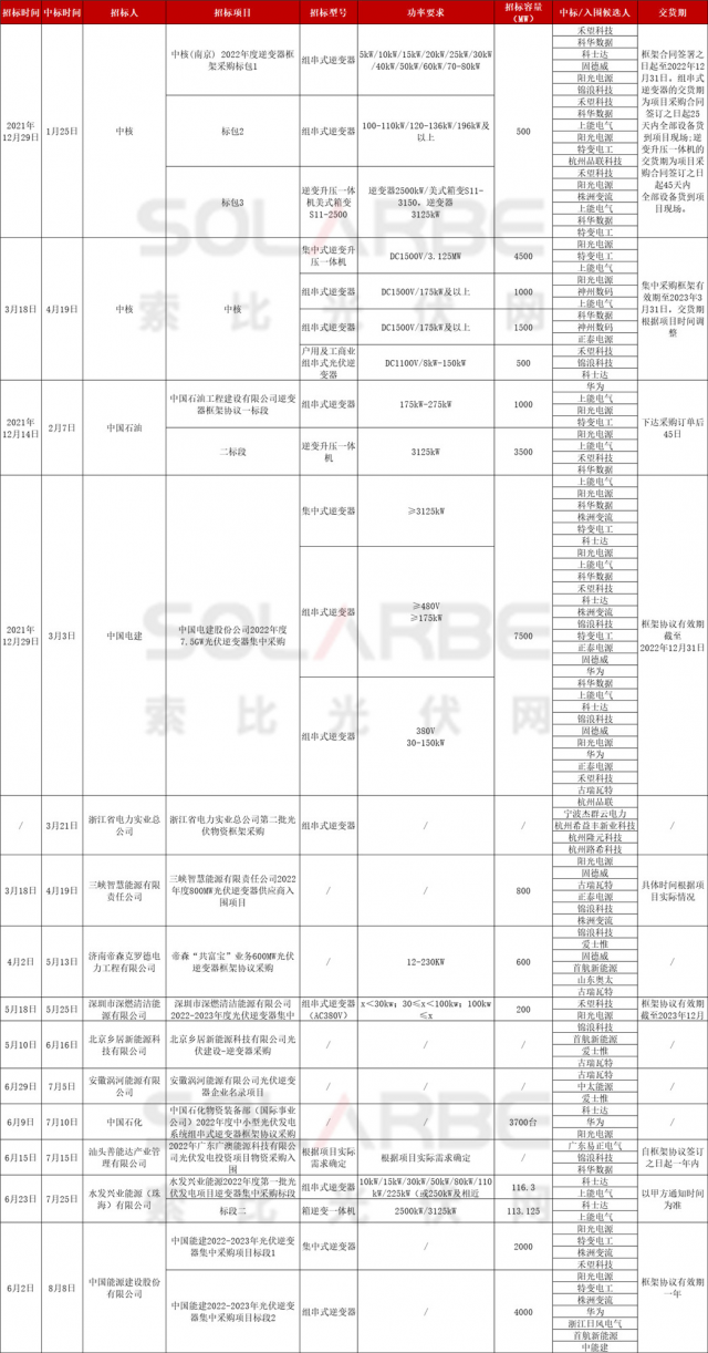 2022開年至今,索比光伏網(wǎng)查詢到超83.7GW光伏逆變器中標(biāo)信息(注:本文均為公開數(shù)據(jù),如有遺漏歡迎補充)。此外,還有三峽3.535GW、華電400MW等逆變器招標(biāo)未公開中標(biāo)結(jié)果。