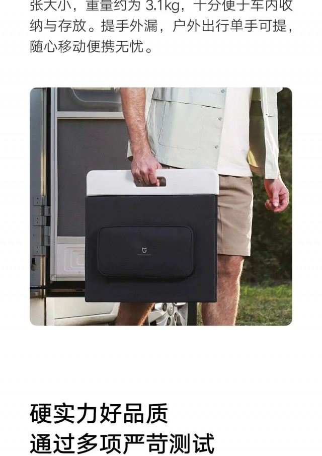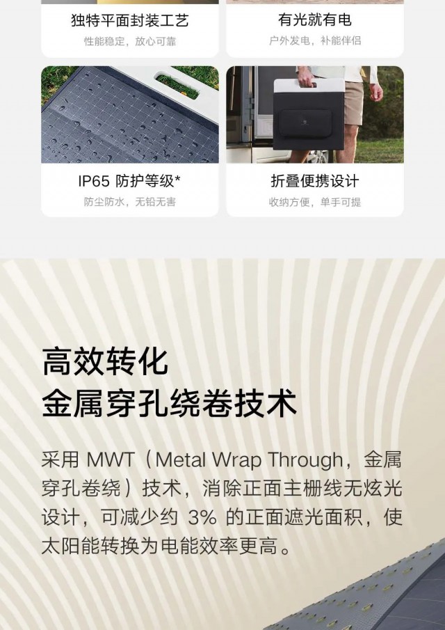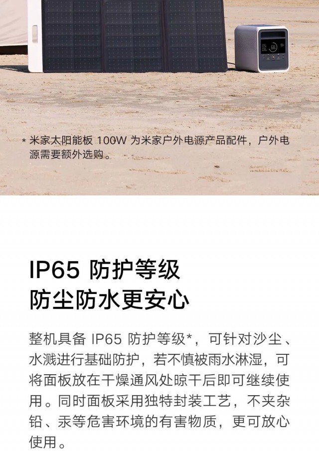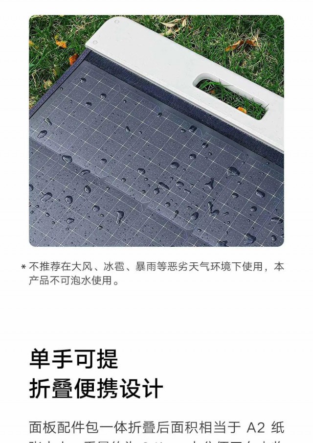 此外,米家太陽能板100W整機具備IP65防護等級,可針對沙塵、水濺等進行基礎(chǔ)防護。面板配件包一體折疊后面積相當(dāng)于A2紙張大小,重量約為3.1kg,十分便于車內(nèi)收納與存放。提手外漏設(shè)計,戶外出行單手可提,隨心移動便攜無憂。