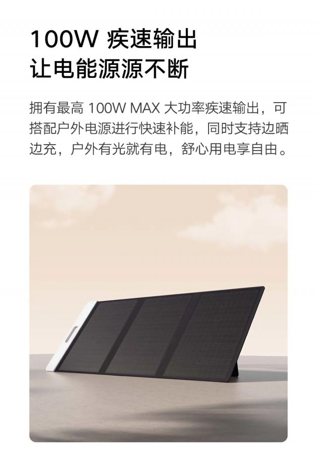 米家太陽能板100W擁有最高100W MAX大功率,可搭配戶外電源進行快速補能,同時支持邊曬邊充,戶外有光就有電。