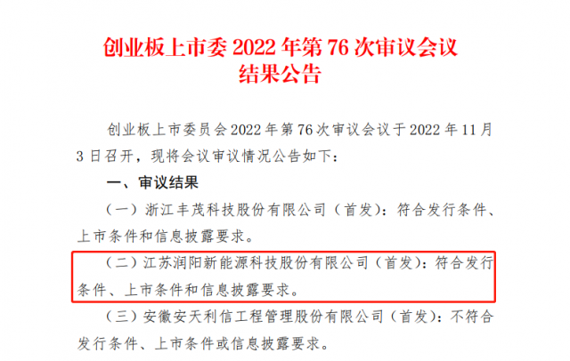 11月3日,深圳證券交易所創(chuàng)業(yè)板上市委員會發(fā)布公告稱,江蘇潤陽新能源科技股份有限公司的首次公開發(fā)行股票申請符合發(fā)行條件、上市條件和信息披露要求。