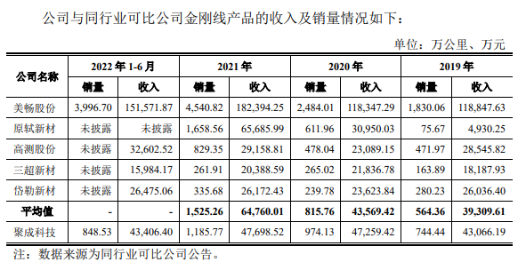 2022年上半年,聚成科技金剛線銷售848.53萬公里,但原軾新材等企業(yè)并非披露具體銷售量,因此無法確定具體情況。