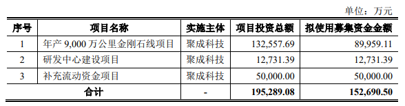 據(jù)悉,本次聚成科技擬募資15.27億元,其中約9億元擬用于年產(chǎn)9000萬公里金剛石線項目、1.27億元用于研發(fā)中心建設項目、5億元用于補充流動資金項目。