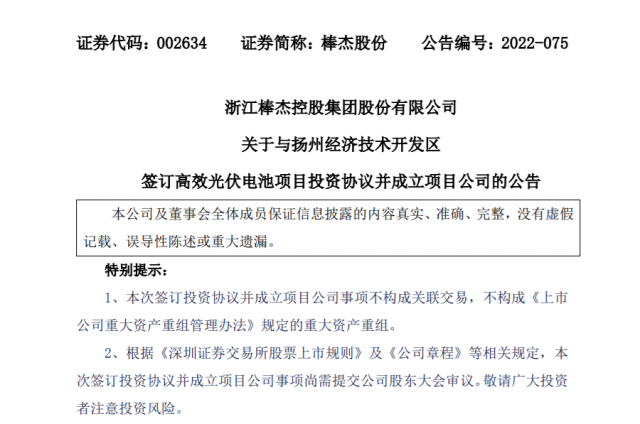 棒杰股份表示結(jié)合自身戰(zhàn)略轉(zhuǎn)型優(yōu)勢(shì)及我國(guó)光伏產(chǎn)業(yè)快速發(fā)展的機(jī)遇,依托戰(zhàn)略股東 光伏領(lǐng)域的豐富經(jīng)驗(yàn)和揚(yáng)州經(jīng)濟(jì)技術(shù)開(kāi)發(fā)區(qū)管委會(huì)體制創(chuàng)新、發(fā)展活力及產(chǎn)業(yè)政 策支持,投資建設(shè)10GW高效光伏電池片生產(chǎn)基地,實(shí)現(xiàn)公司主營(yíng)業(yè)務(wù)向光伏業(yè)的戰(zhàn)略轉(zhuǎn)型升級(jí),形成新的利潤(rùn)增長(zhǎng)點(diǎn),為公司業(yè)務(wù)發(fā)展提供有力支持,是公司實(shí)施戰(zhàn)略發(fā)展的重要舉措,對(duì)公司未來(lái)發(fā)展具有積極意義和推動(dòng)作用。