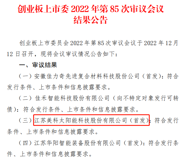 12月12日,深圳證券交易所創(chuàng)業(yè)板上市委員會(huì)發(fā)布公告稱,江蘇美科太陽(yáng)能科技股份有限公司的首次公開(kāi)發(fā)行股票申請(qǐng)符合發(fā)行條件、上市條件和信息披露要求。