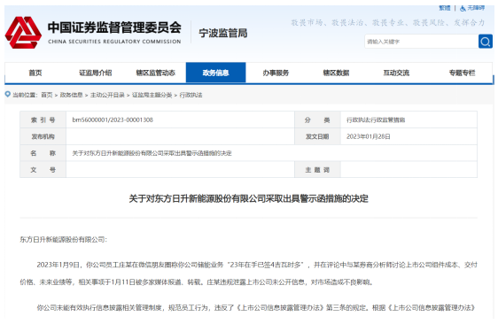 1月28日,寧波證監(jiān)局官網(wǎng)披露的一則《關(guān)于對(duì)東方日升新能源股份有限公司采取出具警示函措施的決定》顯示,東方日升員工莊某在微信朋友圈違規(guī)泄露上市公司未公開(kāi)信息,對(duì)市場(chǎng)造成不良影響。因公司未能有效執(zhí)行信息披露相關(guān)管理制度,規(guī)范員工行為,違反了《上市公司信息披露管理辦法》第三條的規(guī)定,寧波證監(jiān)局決定對(duì)東方日升采取出具警示函的行政監(jiān)管措施。