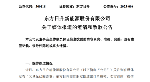 東方日升還表示,莊某通過(guò)其朋友圈向特定對(duì)象泄露公司未公開(kāi)信息,在一定程度上有違信息披露的公平性原則。莊某所述的在手已簽訂單數(shù)據(jù)并非公司實(shí)際儲(chǔ)能業(yè)務(wù)雙簽訂單數(shù)據(jù),存在口徑的差異。莊某的上述不當(dāng)?shù)膫€(gè)人行為給媒體及投資者造成了一定的誤導(dǎo),對(duì)此,公司表示誠(chéng)摯的歉意。未來(lái),公司將繼續(xù)通過(guò)內(nèi)部培訓(xùn)、風(fēng)險(xiǎn)提示等多種措施,強(qiáng)化公司相關(guān)內(nèi)部人員對(duì)于信息披露合規(guī)和底線的認(rèn)識(shí)和理解,提高員工的信息披露合規(guī)意識(shí)、履職能力以及專(zhuān)業(yè)化水平。