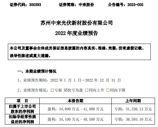 中來(lái)股份(300393)近日發(fā)布2022年年度業(yè)績(jī)預(yù)告,報(bào)告期內(nèi)歸屬于上市公司股東的凈利潤(rùn)34,600萬(wàn)元–41,000萬(wàn)元,較上年同期扭虧為盈。