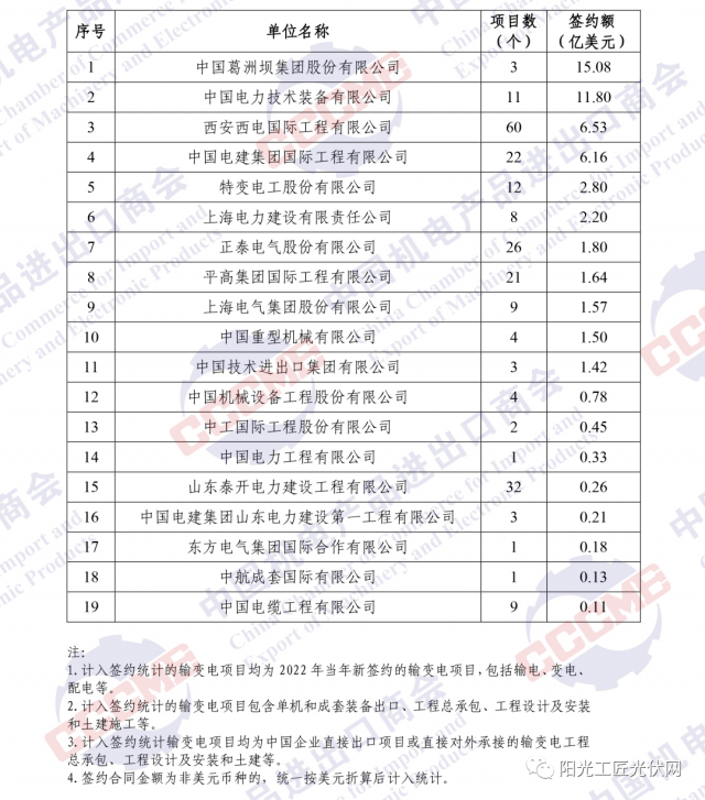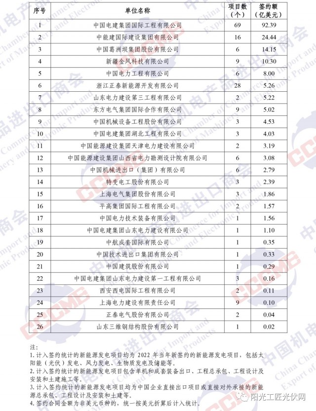 根據(jù)各重點企業(yè)報送的2022年境外電力項目的新簽約情況,中國機電商會對企業(yè)簽約額進行了排名?,F(xiàn)將企業(yè)排名及火電、水電、輸變電、新能源(太陽能、風、生物質、儲能等)及太陽能(光伏)、風電行業(yè)簽約排名予以發(fā)布。