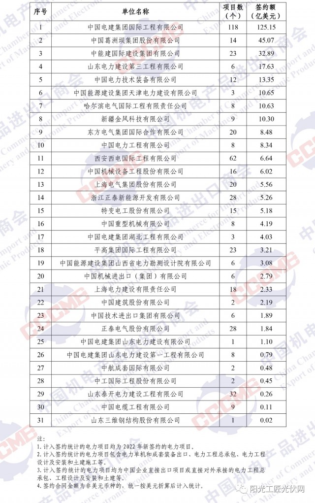 2022年中國企業(yè)境外電力項目簽約額排名
