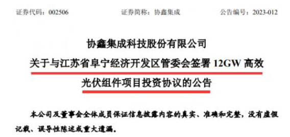 2月15日,協(xié)鑫集成發(fā)布公告稱,該公司擬在江蘇省阜寧經(jīng)濟(jì)開發(fā)區(qū)投資建設(shè)12GW高效光伏組件項目。