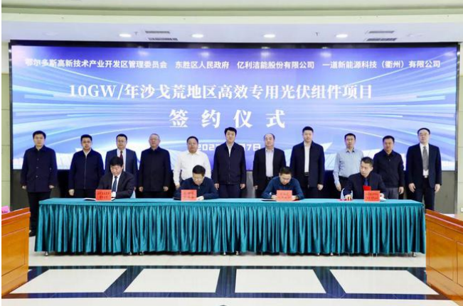 3月7日,在內(nèi)蒙古風(fēng)光氫儲(chǔ)產(chǎn)業(yè)集群重鎮(zhèn)鄂爾多斯東勝區(qū),億利潔能股份有限公司與鄂爾多斯高新技術(shù)產(chǎn)業(yè)開發(fā)區(qū)管委會(huì)、東勝區(qū)人民政府、一道新能源科技(衢州)有限公司成功簽約10GW沙戈荒地區(qū)高效專用光伏組件項(xiàng)目。