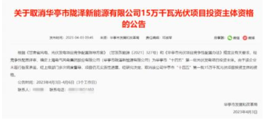 2023年4月3日華亭市發(fā)展和改革局發(fā)文,根據(jù)《甘肅省風(fēng)電、光伏發(fā)電項(xiàng)目競(jìng)爭(zhēng)配置指導(dǎo)方案》(甘發(fā)改能源〔2021〕327號(hào))和《華亭市光伏項(xiàng)目競(jìng)爭(zhēng)性配置辦法》規(guī)定及有關(guān)要求,經(jīng)競(jìng)爭(zhēng)性配置評(píng)審,確定上海電氣風(fēng)電集團(tuán)股份有限公司(華亭市隴澤新能源有限公司)為華亭市“十四五”第一批光伏發(fā)電項(xiàng)目投資主體。由于該企業(yè)未履行備案承諾,經(jīng)上級(jí)部門多次調(diào)度督導(dǎo),項(xiàng)目仍無實(shí)質(zhì)性進(jìn)展,經(jīng)研究決定,取消該公司華亭市“十四五”第一批15萬千瓦光伏項(xiàng)目投資主體的資格。公告時(shí)間:2023年4月3日-4月6日(3個(gè)工作日)