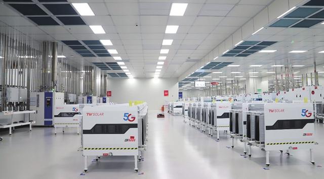 此外,通威還打造全球光伏行業(yè)首個5G智慧園區(qū)——通威太陽能成都金堂基地。基地內擁有11個足球場大小的無塵車間,32條全自動智能制造生產(chǎn)線高效運轉,數(shù)百臺智能小車來回穿梭運送物料,經(jīng)過制絨、擴散、SE激光摻雜等10道工序,每天生產(chǎn)500多萬片太陽能電池片。這里的智能制造生產(chǎn)線,與同等產(chǎn)能的傳統(tǒng)太陽能電池片生產(chǎn)線相比,用工減少約62%,能源消耗降低約30%,生產(chǎn)效率提升約161%。