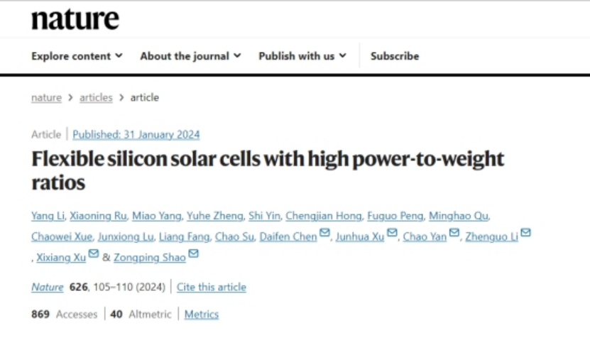 近日,隆基綠能與江蘇科技大學(xué)、澳大利亞科廷大學(xué)三方合作,在國(guó)際上首次制造出高柔韌性、高功率重量比的晶硅異質(zhì)結(jié)太陽(yáng)能電池,相關(guān)研究成果以“Flexible silicon solar cells with high power-to-weight ratios”為題發(fā)表在國(guó)際期刊《Nature》(自然)上。