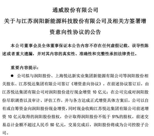據(jù)公告顯示,在前述協(xié)議簽訂后,由江蘇悅達集團有限公司對潤陽股份進行現(xiàn)金增資10億元;在通威股份完成對潤陽股份盡職調(diào)查以及審計、評估工作,并與各方達成正式增資具體方案后,公司以自有或自籌資金向潤陽股份現(xiàn)金增資,同時現(xiàn)金收購悅達集團前述增資10億元取得的潤陽股份股權,合計取得潤陽股份不低于51%的股權。