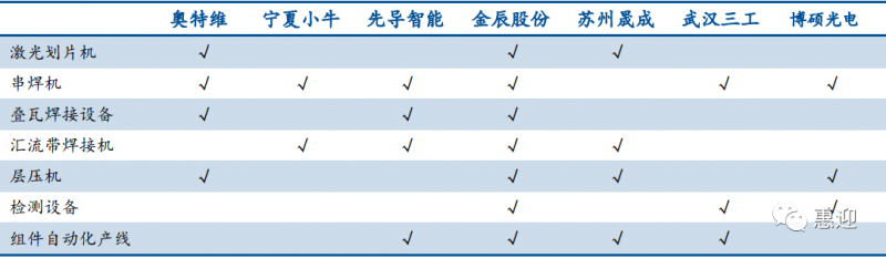 公司光伏組件制造裝備基本涵蓋組件制備的各工藝流程,提供光伏組件自動(dòng)化生產(chǎn)線的同時(shí),也具備自主的軟件系統(tǒng)。公司的自動(dòng)雙軌串焊機(jī),采用紅外加熱焊接,焊接溫度及功率閉環(huán)控制,溫度爬升平緩、熱沖擊小,確保設(shè)備高重復(fù)性和穩(wěn)定的產(chǎn)能,獨(dú)創(chuàng)柔性壓持機(jī)構(gòu)輔助焊接,有效降低焊接隱裂、碎片發(fā)生概率,且易于安裝維護(hù)。公司的激光劃片機(jī)采用進(jìn)口激光器,切割深度穩(wěn)定,采用 CCD 精密定位。為探索更多增長點(diǎn),公司較早布局疊瓦組件設(shè)備,目前疊瓦組件設(shè)備已經(jīng)向國內(nèi)頭部光伏客戶供貨,并獲得了客戶的良好認(rèn)可。