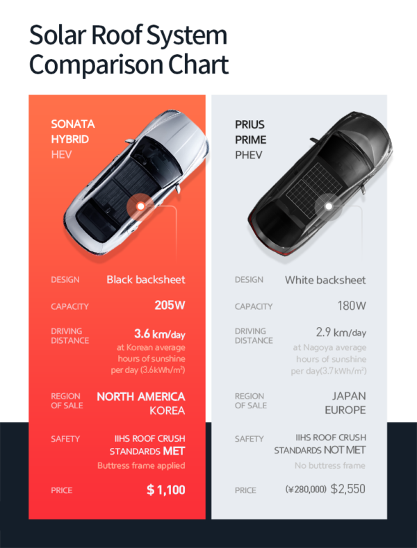 現(xiàn)代公司表示,其太陽能電池陣列系統(tǒng)與競爭對(duì)手的汽車相比具有高效的設(shè)計(jì)優(yōu)勢,如配備太陽能車頂?shù)呢S田普銳斯。普銳斯有一個(gè)單獨(dú)的太陽能電池,需要兩個(gè)階段的轉(zhuǎn)換來為高壓驅(qū)動(dòng)電池和輔助“啟動(dòng)”電池充電。索納塔只進(jìn)行一次轉(zhuǎn)換,直接通過電池板向最大功率點(diǎn)跟蹤器充電控制器輸送電力,并直接進(jìn)入輔助電池和驅(qū)動(dòng)電池。
