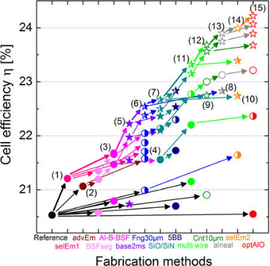 在理論研究方面,ISFH的Byungsul Min等人分別從新型發(fā)射極結構、摻硼鋁背場、減少正面電極柵線寬度、提高硅片質量、多主柵等技術優(yōu)化路徑進行分析,研究不同的優(yōu)化途徑對PERC電池效率提升效果,得出PERC電池的量產效率可提升至24%以上,如圖5所示。