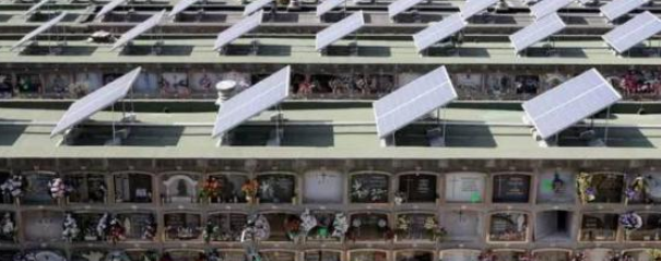 2008年,西班牙巴塞羅那附近小鎮(zhèn)桑塔克羅瑪將大量太陽能電池板安放到了一個“極少有人打攪的地方”——墓地。這個墓地的特別之處在于,462塊整齊劃一的太陽能電池板出現(xiàn)在墓地內部,棺材一層層碼放起來,其中最高的“棺材樓”竟達到了五層,太陽能電池板就放在最高一層棺材上面。這些太陽能電池板生產(chǎn)的電能足夠滿足60戶居民的年需求,能讓該鎮(zhèn)一年減少向大氣中排放大約62噸二氧化碳。