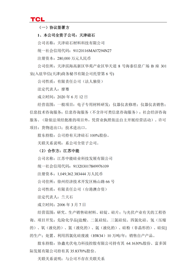 7月7日,TCL科技發(fā)布公告稱,今年4月與協(xié)鑫集團有限公司及關(guān)聯(lián)方簽訂《合作框架協(xié)議書》,就投資新建光伏級和電子級硅料項目開展合作。