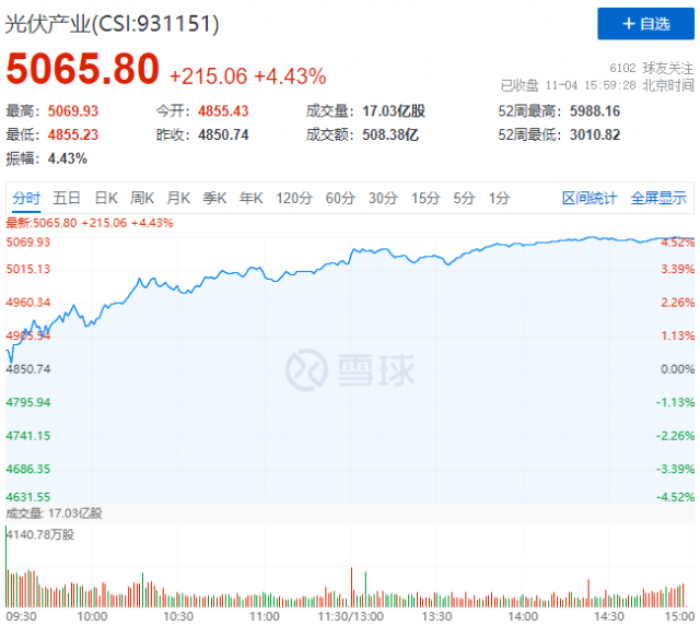 11月4日,光伏板塊全線大漲,中證光伏產(chǎn)業(yè)指數(shù)(CSI:931151)報(bào)收5066點(diǎn),漲幅達(dá)到4.43%。