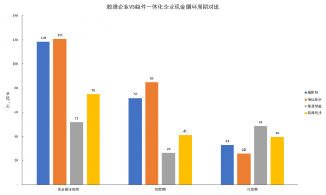 以膠膜業(yè)務(wù)占比較高的福斯特和海優(yōu)新材為例,兩者截至2022Q3的收款期分別為72天和85天,付款期卻僅為33天和26天。受此影響,兩者的現(xiàn)金循環(huán)周期分別高達(dá)119天和121天,即使是采取垂直一體化模式的組件廠商也僅在60-80天左右。