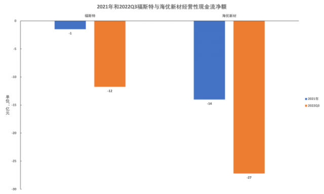 而且,隨著經(jīng)營規(guī)模的擴(kuò)大,企業(yè)的營運(yùn)壓力也不斷提升。截至2022Q3,福斯特和海優(yōu)新材的應(yīng)收賬款較2021年全年提高32%和52%,預(yù)付款項(xiàng)提高195%和347%。而流動(dòng)比率則下降53%和25%,經(jīng)營性現(xiàn)金流更是呈凈流出態(tài)勢,且規(guī)模顯著提升,分別達(dá)到11.76億元和27.20億元,降幅高達(dá)695%和94%。