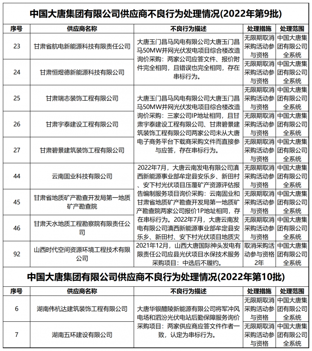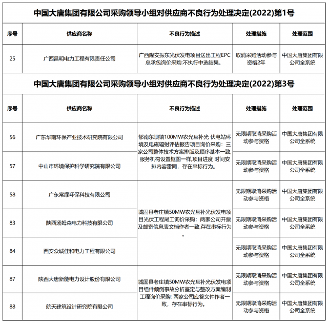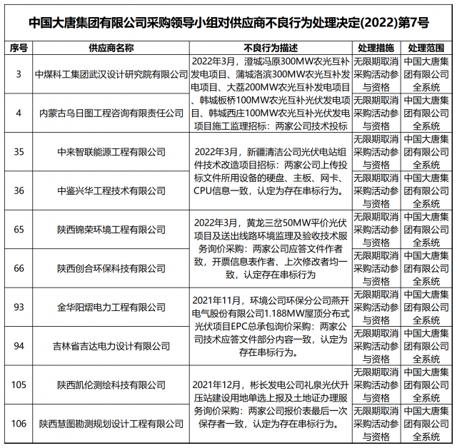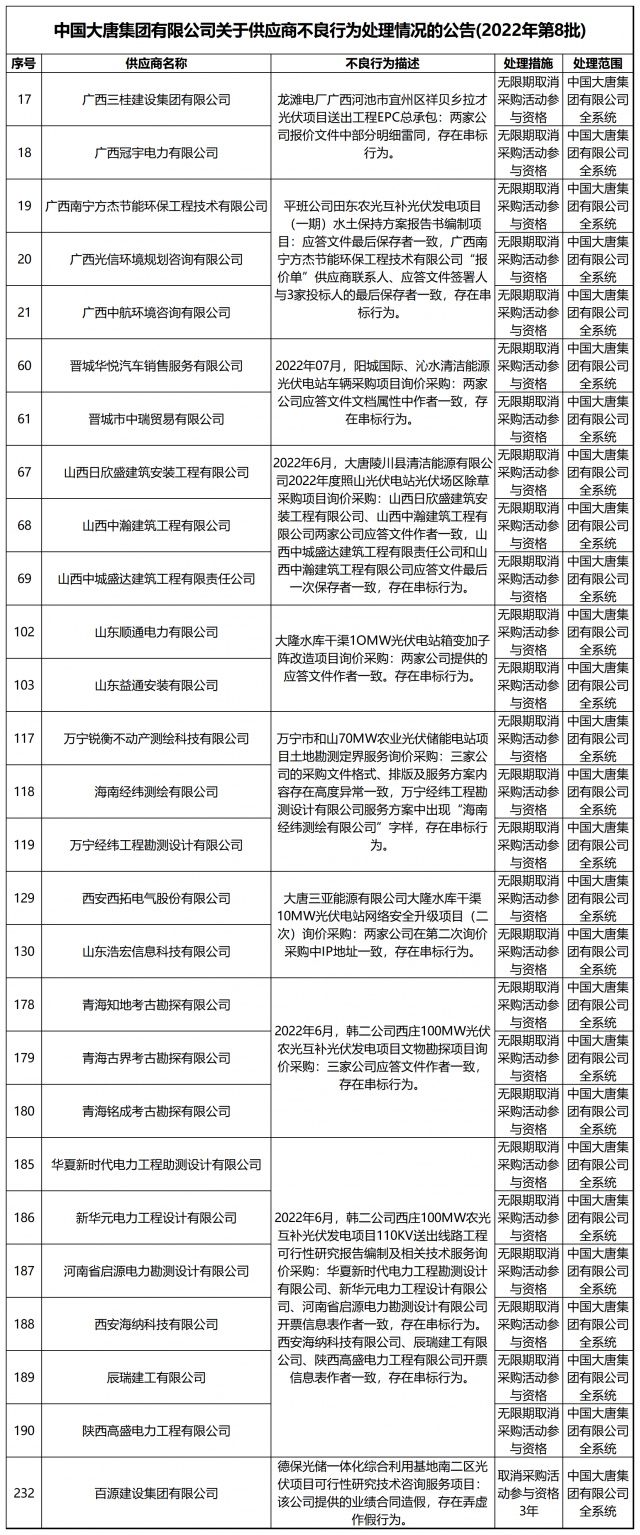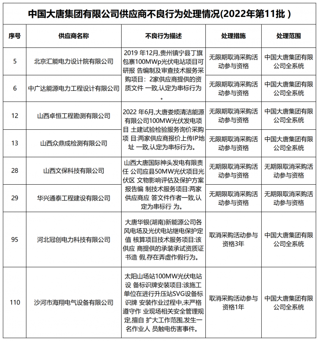 12月13日,中國大唐集團有限公司關于供應商不良行為處理情況的公告 (2022年第12批)公示,對出現(xiàn)不誠信行為、履約不力以及產品質量等問題的供應商進行了處理。本批次大唐集團共公布受處罰企業(yè)137家,其中,光伏相關企業(yè)共6家。