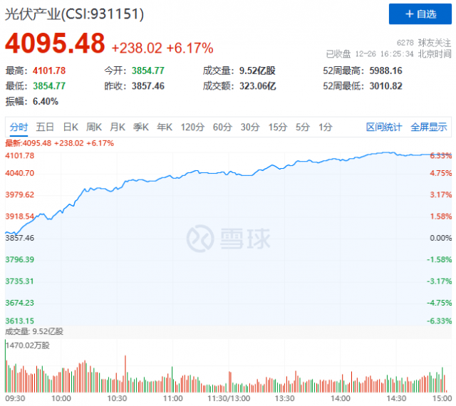 12月25日,近期持續(xù)下跌的光伏板塊迎來(lái)報(bào)復(fù)性反彈,中證光伏產(chǎn)業(yè)指數(shù)(CSI:931151)暴漲6.17%,報(bào)收4095點(diǎn)。其中,膠膜、儲(chǔ)能、逆變器、HJT、組件概念漲幅居前。