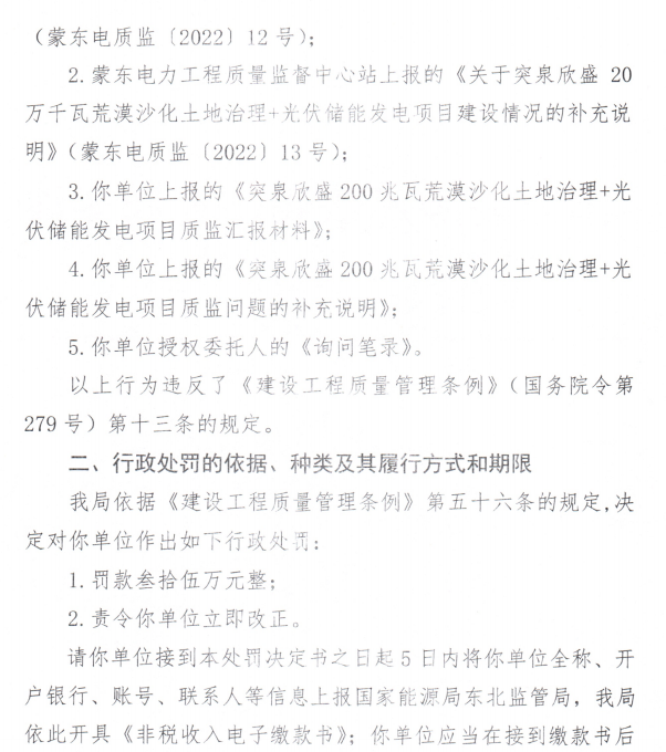 日前,東北能源監(jiān)管局向突泉欣盛太陽能發(fā)電有限公司開出一張罰單,經(jīng)調查核實,你單位投資建設的突泉欣盛200兆瓦荒漠沙化土地治理+光伏儲能發(fā)電項目未按照國家有關規(guī)定辦理工程質量監(jiān)督手續(xù)。