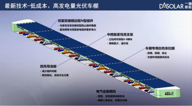 在第六屆分布式能源嘉年華上,一道新能源系統(tǒng)工程創(chuàng)新研究院院長(zhǎng)韓利生分享了零碳服務(wù)區(qū)的光儲(chǔ)充一體化停車(chē)場(chǎng)解決方案。他表示一道新能推出的停車(chē)區(qū)光伏解決方案,以高效、美觀、便捷為理念,對(duì)于常規(guī)停車(chē)棚造價(jià)高、發(fā)電量低、設(shè)計(jì)感缺失等缺點(diǎn)進(jìn)行了針對(duì)性優(yōu)化。首先,采用中跨距柔性高支架代替常規(guī)短跨距鋼架式結(jié)構(gòu),降低了造價(jià),同時(shí)為N型雙面鋼邊框組件提供最佳傾角,確保整面發(fā)電量最優(yōu);其次,布置白色張拉膜作為防曬防雨材料,并利用其反光特性,增加雙面組件的背面發(fā)電量;最后,采用防風(fēng)導(dǎo)流板、安全隔離護(hù)板等結(jié)構(gòu),將光伏組件迎風(fēng)面和地面電氣設(shè)備保護(hù)起來(lái),既提高了安全性、又增加了美觀性。