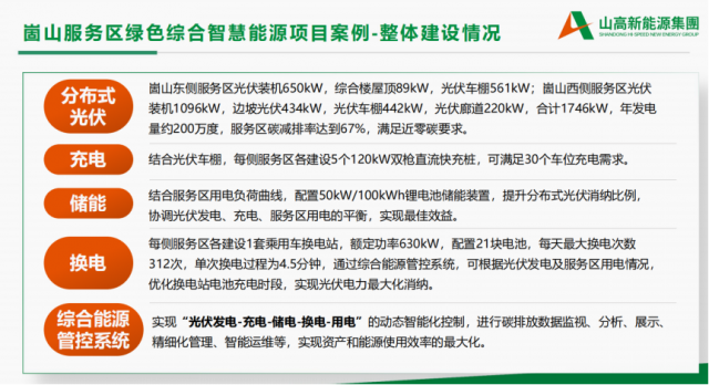 舉例來(lái)說(shuō),崮山服務(wù)案區(qū)綠色綜合智慧能源項(xiàng)目位于濟(jì)南長(zhǎng)清區(qū)京臺(tái)高速段,占地約260 畝,其中,東側(cè)服務(wù)區(qū)較為狹長(zhǎng),西側(cè)服務(wù)區(qū)背靠崮 云湖,周邊旅游資源豐富,西側(cè)服務(wù)區(qū)內(nèi)已建成酒店和觀光廊道。崮山服務(wù)區(qū)年用電量約300萬(wàn)度,折合年碳排放量約2653噸,服務(wù)區(qū)當(dāng)前變壓器總?cè)萘繛?500kVA。崮山服務(wù)區(qū)已建成充電樁共8個(gè)、污水處理設(shè)施、多聯(lián)機(jī)中央空調(diào)系統(tǒng)等,本次建設(shè)內(nèi)容包括分布式光伏、 儲(chǔ)能、充電站、換電站、綜合能源管理系統(tǒng)等。實(shí)現(xiàn)“光伏發(fā)電-充電-儲(chǔ)電-換電-用電”的動(dòng)態(tài)智能化控制,進(jìn)行碳排放數(shù)據(jù)監(jiān)視、分析、展示、精細(xì)化管理、智能運(yùn)維等,實(shí)現(xiàn)資產(chǎn)和能源使用效率的最大化。