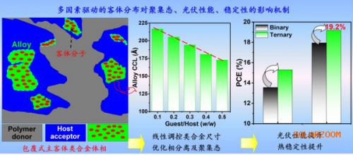 進(jìn)一步,研究對(duì)外圍功能化的客體分子主骨架進(jìn)行再調(diào)控,獲得了高質(zhì)量的類合金體相,同時(shí),類合金聚集體的晶域尺寸可以通過客體摻雜比例進(jìn)行線性調(diào)控(圖2)。相比受體相內(nèi)同時(shí)存在客體自聚集區(qū)域及類合金區(qū)域,該研究中客體分子與主體受體具有高度兼容性。實(shí)驗(yàn)結(jié)果分析顯示幾乎所有的客體分子均參與類合金體相的構(gòu)建,這是類合金晶域尺寸可以線性調(diào)控的本質(zhì)原因。同時(shí),客體分子摻雜后,無論是主體聚合物給體還是主體受體的結(jié)晶性均得到增強(qiáng),促進(jìn)了垂直方向空穴和電子的傳輸。此外,客體分子形成的類合金聚集體均包覆在主體受體相內(nèi),形成了核殼結(jié)構(gòu)(主體包覆客體),增強(qiáng)了主客體之間的能量轉(zhuǎn)移。對(duì)于這種獨(dú)特的聚集態(tài)結(jié)構(gòu),研究首次提出了具有普適性的主客體結(jié)晶性、表面能、兼容性相互關(guān)系以及給受體相互作用四要素協(xié)同作用的驅(qū)動(dòng)機(jī)制。此類獨(dú)特的主客體聚集態(tài)及分子堆積,對(duì)于提高電荷傳輸、抑制電荷復(fù)合起到重要作用。研究將其作為客體分子進(jìn)行摻雜,在多個(gè)體系中實(shí)現(xiàn)了超過80%的填充因子(最高達(dá)到81.1%)和19.2%的高能量轉(zhuǎn)換效率。除了效率提升外,研究再次發(fā)現(xiàn)類合金體相的形成明顯改善了OSC的穩(wěn)定性,驗(yàn)證了類合金體相對(duì)抑制亞穩(wěn)態(tài)形成、提高光伏電池穩(wěn)定性的作用。