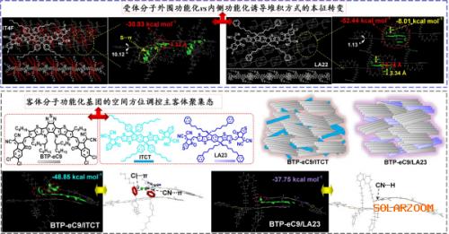 該研究優(yōu)化受體分子側(cè)鏈功能基團(tuán)的位置(圖1),將face-to-face/face-to-edge混合取向堆積的客體分子轉(zhuǎn)換為100% face-to-face優(yōu)勢(shì)取向,提高了垂直方向的電子傳輸性能。單晶解析和相關(guān)理論分析發(fā)現(xiàn),側(cè)鏈外圍功能化的分子可以通過外圍共軛平臺(tái)與相鄰受體分子骨架形成緊密的π-π相互作用,使分子取向?qū)崿F(xiàn)定向錨定。而相對(duì)于功能化基團(tuán)在內(nèi)側(cè)的客體分子,外圍功能化的客體與主體受體之間形成類合金聚集態(tài),呈現(xiàn)出更為規(guī)整的分子排列與取向,降低了受體相內(nèi)的缺陷密度及復(fù)合損失。摻雜后的OSC光伏效率達(dá)到19.12%,且類合金體相在熱力學(xué)上更趨向于平衡態(tài),OSC的熱穩(wěn)定性得到明顯提升。因此,調(diào)控?fù)诫s客體分子的堆積取向及主客體相互作用,對(duì)獲得合適相分離、抑制亞穩(wěn)態(tài)生成、提升光伏電池穩(wěn)定性具有積極作用。