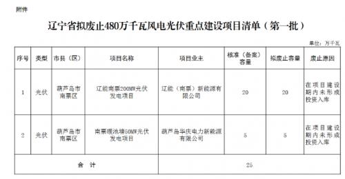 公告稱,遼寧省480萬千瓦風(fēng)電光伏重點建設(shè)項目中存在“核而不建”“建設(shè)滯后”等問題的風(fēng)電光伏項目進(jìn)行了梳理。相關(guān)地市上報了擬廢止項目清單,經(jīng)我委匯總,擬廢止未按期建成并網(wǎng)的遼能南票200MW光伏發(fā)電項目、南票暖池塘50MW光伏發(fā)電項目等2個光伏發(fā)電項目共計25萬千瓦未并網(wǎng)規(guī)模指標(biāo)。