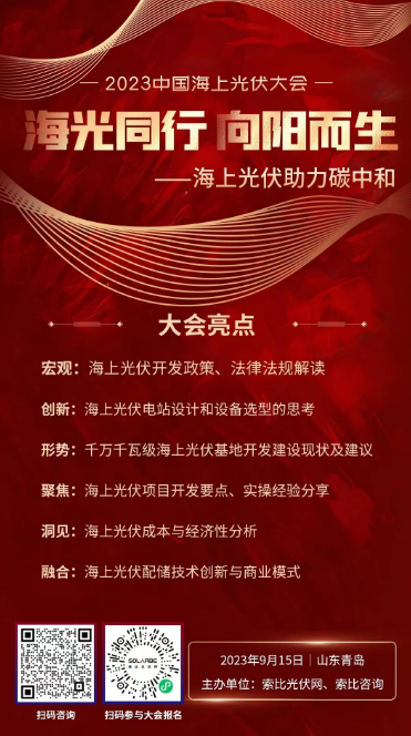 2023年9月15日,索比光伏網(wǎng)以“海光同行,向陽而生——海上光伏助力碳中和”為主題,計劃在山東青島舉辦“2023中國海上光伏大會”,為協(xié)力打造技術先進、生態(tài)友好、智慧融合的“環(huán)渤海、沿黃海”雙千萬千瓦級海上光伏基地貢獻力量。