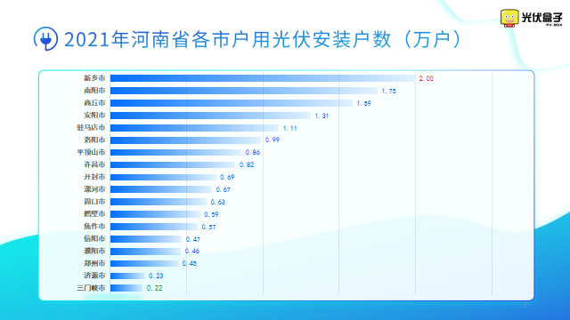 新鄉(xiāng)市是河南省戶用光伏安裝戶數(shù)最高的城市,也是戶用光伏裝機容量最高的城市,2021年全年安裝了2萬戶,447.17MW。