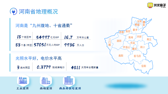 河南是“九州腹地,十省通衢”,有83個縣,9936萬人口,戶用發(fā)展基礎好。加上電價水平較高,光照水平較好,極適合發(fā)展大批量的戶用光伏電站。
